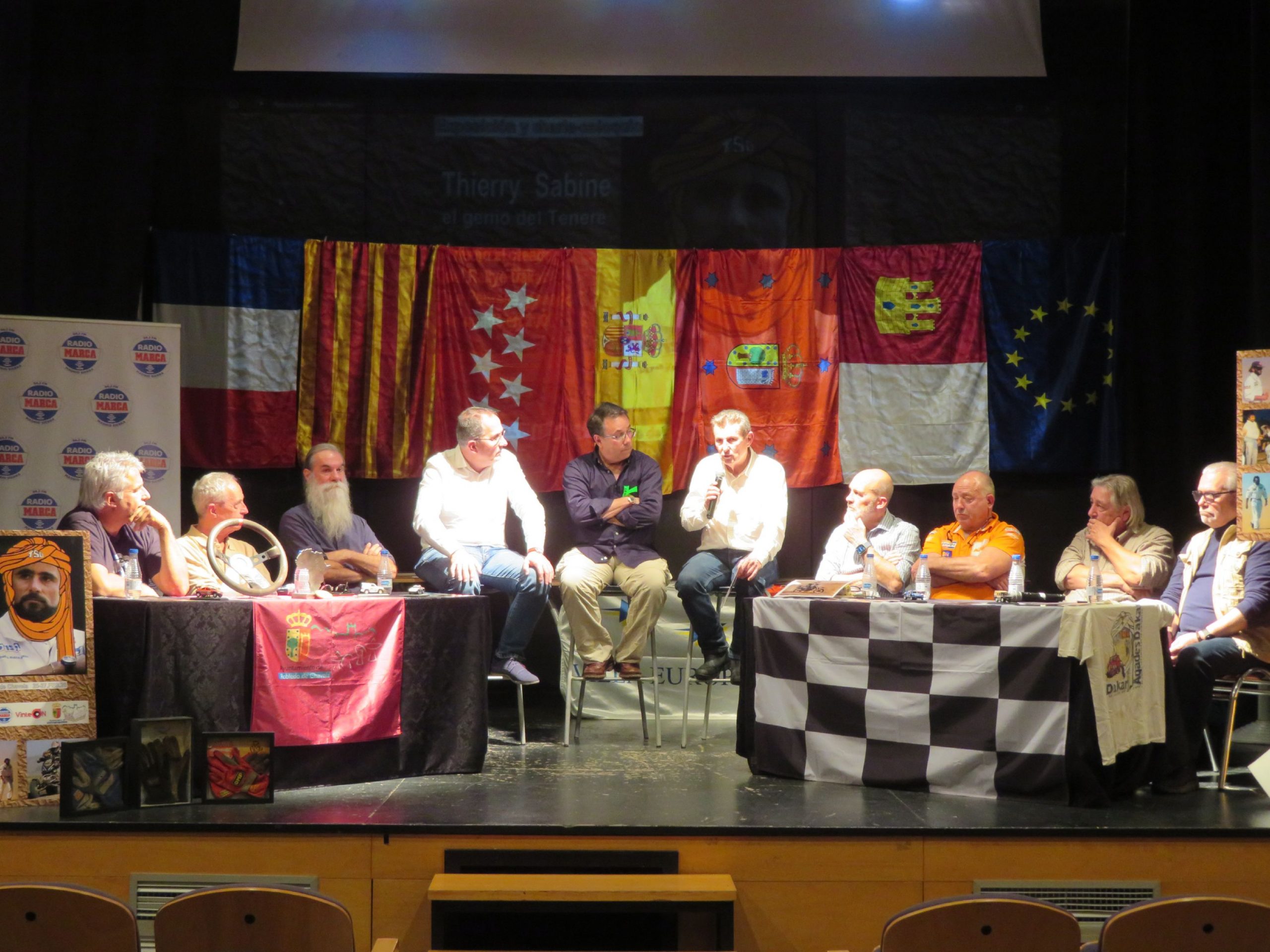 Intervinieron Juan Porcar -primer participante español en moto y dos veces en el top ten de coches- y Jordi Arcarons -seis podios y 27 victorias de etapas-, por vídeo para abrir la conferencia. Después Joan Manuel González ‘Pedregà’, primer español ganador del Dakar en quad en 2006, José María Ginés, piloto automovilista participante en cinco ediciones, que fue primer madrileño en coches (66º) en 1997; Juan Hernández-Luike, primer piloto madrileño en motos en el Dakar, con cuatro participaciones, siendo segundo en la clase maratón en 1988; Sirio Sáinz, copiloto y navegante de diversos equipos en diez Dakar, siendo 37º de la general y 2º de su categoría en 2001; Enrique Hernández, exdirector de carrera adjunto del Dakar en motos en 1995; Alejandro Sanz, distinguido mecánico en destacados equipos -alguno ganador- en veinte ediciones del rallye; Ricardo Rico, fundador de la Asociación Madrileña de Ayuda a la Infancia, Amaif, con proyectos en Burkina Faso (antiguo Alto Volta por donde pasaba el Dakar); y los periodistas especializados Ramiro Mansanet y Juan Luis Soto, acompañados por Goyo Ybort, promotor de la exposición.