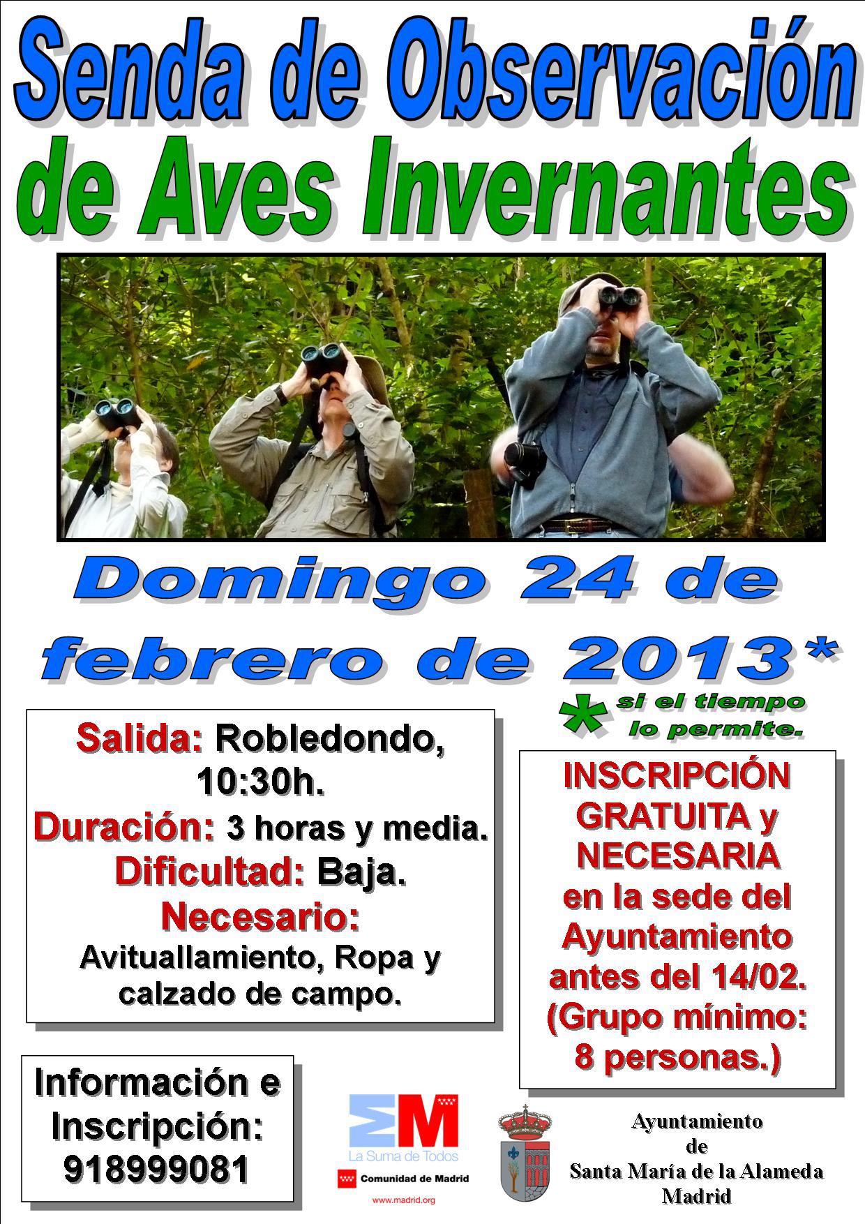 El ayuntamiento de Santa María de la Alameda y la Comunidad de Madrid organizan una senda de observación de dificultad baja para visualizar y conocer a las aves invernantes que transitan por nuestra comarca en estos tiempos invernales. La ruta se llevará a cabo el próximo domingo 24 de febrero, si el tiempo lo permite y si antes del día 14 se ha inscrito un grupo mínimo de ocho personas.